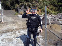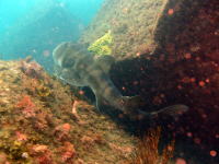 | 今日は福浦へ。若干、ウネリ有りのコンディションでしたが、特に問題なく潜ることが出来ました。水中はと言うと、もう大当たり!目の前をオオモンカエルが泳いで来たり、軽く1m超えの巨大ネコザメに遭遇したりとNさん、大喜びでした。 |