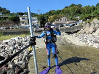 | 今日の福浦は、ほぼ貸切状態でノンビリと潜れました。透明度的には残念でしたが、T社長に教わったポイントへ行ったら、とんでもない群れ群れ群れ!!!イサキ、クロホシ、アジ、カマスなど凄かったですよ!ちょっと遠かったんですが、Sさんも大喜びでした。 |