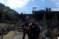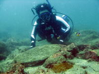 | 大島ツアー初日は人気ポイントの秋の浜へ。平日なんでダイバーも少なくのんびりと潜れました。今回は初・大島の方がほとんどだったんでキンギョハナダイの群れなどに大喜びでした。その他、ヌノサラシ、ツノダシ、モンツキハギなどが見れました。 |