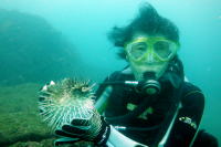 今日も江の浦へ。風波有りのコンディションでしたが、透明度はやや回復してきました。人気のオオモン、クマドリカエルアンコウは健在でした。その他、巨大ヒラメに遭遇してビックリ!直後に巨大コブダイにも遭遇!!Yちゃん、大喜びでした。 |